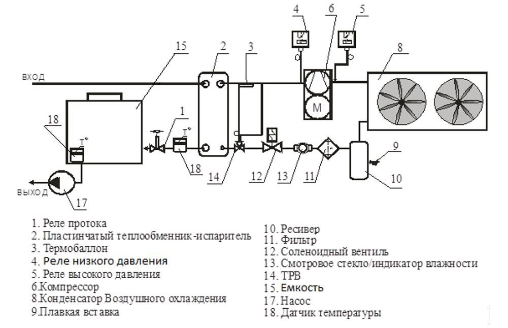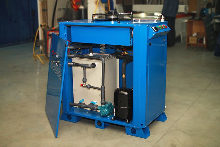 Установка выполнена в виде холодильного блока (металлический каркас, окрашенный порошковой краской с защитно-декоративными легкосъемными панелями). Из установки выведены четыре водяных штуцера: два по Ø1” для долива и слива жидкости и два по Ø1” для подведения гидравлических коммуникаций потребителя, шаровый кран для слива жидкости из емкости.