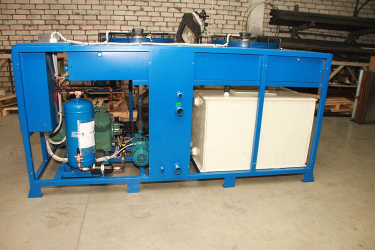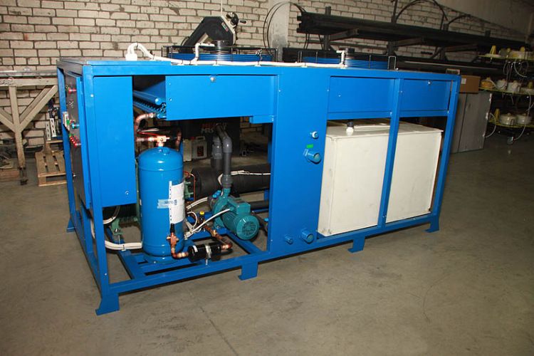 Установка выполнена в виде холодильного блока (металлический каркас, окрашенный порошковой краской с защитно-декоративными легкосъемными панелями). Из установки выведены четыре водяных штуцера: два по Ø1” для долива и слива жидкости и два по Ø1” для подведения гидравлических коммуникаций потребителя, шаровый кран для слива жидкости из емкости.